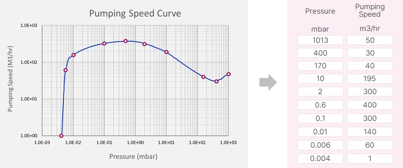 A pump name usually uses the peak pumping speed, so it can be misunderstood as having this value in all pressure ranges. But the pumping speed of pump is not a constant value.